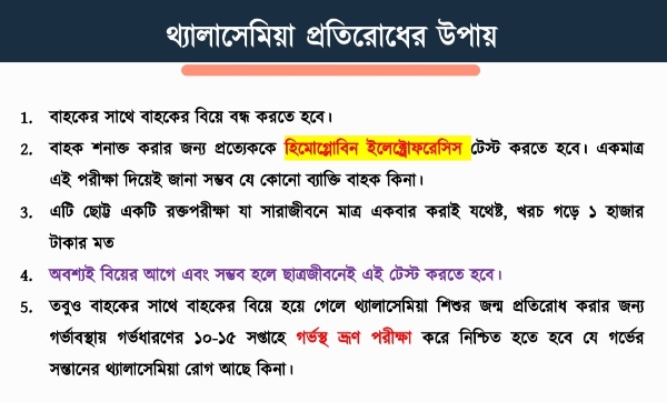 i) Preventing marriage between two thalassemia carriers, after knowing whether or not someone is a carrier through a blood test (Hemoglobin Electrophoresis) before marriage, known as premarital screening. Carriers carry the thalassemia gene silently and do not show any symptoms. The Hemoglobin Electrophoresis test is enough to be done once in a lifetime and only this test can diagnose thalassemia carriers.